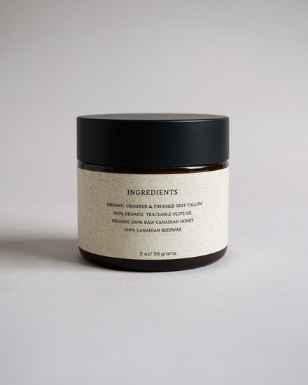 Grass-fed and grass-finished beef tallow closely mirrors the skin’s natural lipids, helping to repair and protect a compromised barrier. Organic traceable olive oil softens and supports hydration, while 100% raw organic honey helps retain moisture and promote calm, resilient skin. Organic filtered Canadian beeswax seals in nourishment and shields without clogging pores.