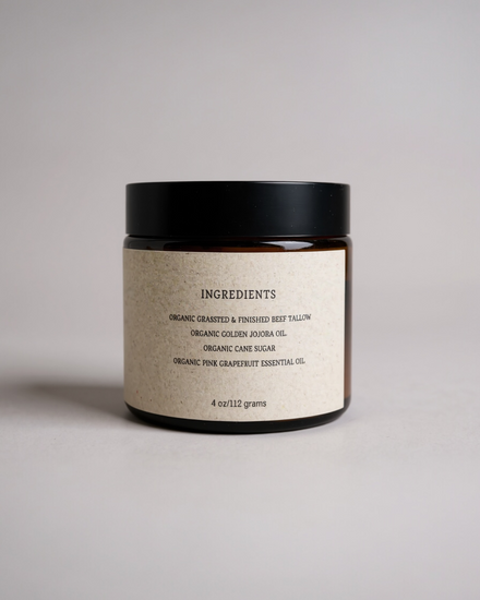 Grass-fed and grass-finished beef tallow mirrors the skin’s natural lipids, replenishing moisture and supporting barrier health. Organic golden jojoba oil softens and balances, helping refine texture without clogging pores. Organic raw cane sugar provides a delicate, natural exfoliation that lifts away dullness while maintaining hydration. Finished with organic pesticide-free grapefruit essential oil, the scrub refreshes the senses while promoting a brighter, clearer-looking complexion.